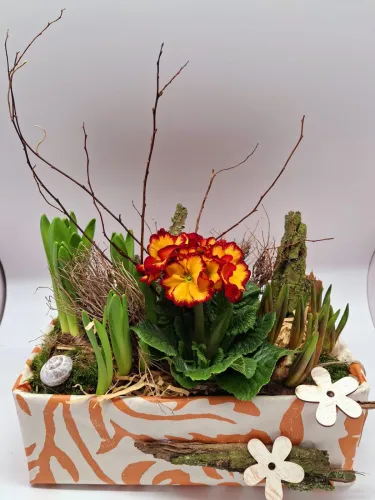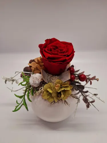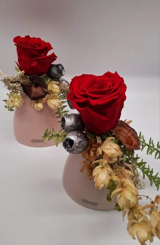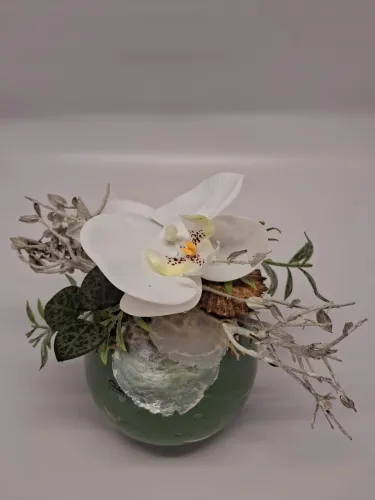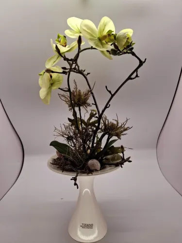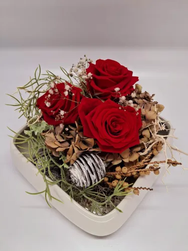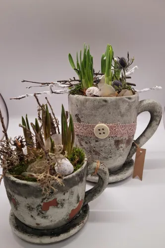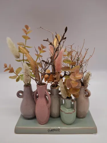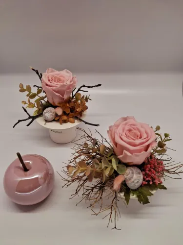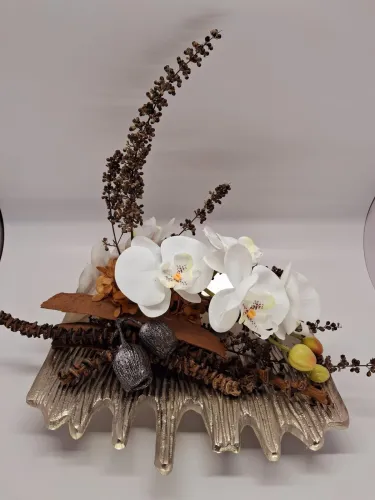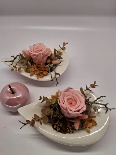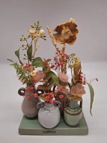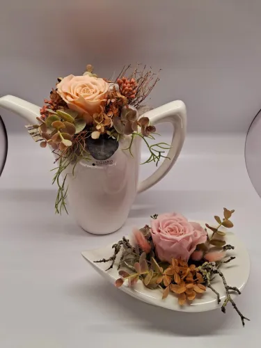Zu unseren individuellen Blumengestaltungen bieten wir Ihnen auch Keramikprodukte wie zum Beispiel Pflanzenschalen sowie Trockengestecke und Kunstblüten an.